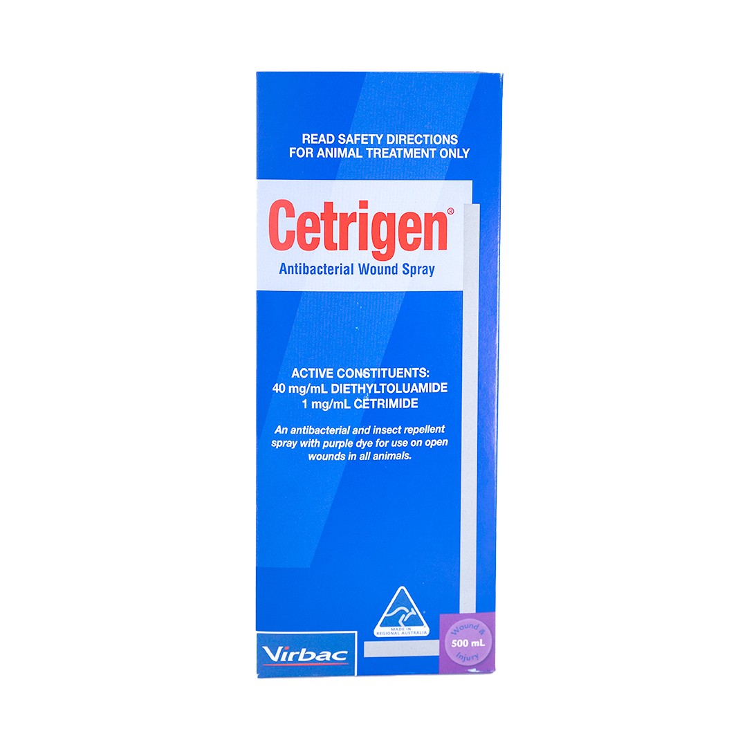 Antibacterial aerosol/spray with insect repellent activity; contains purple dye for use on open wounds in cattle, sheep, pigs, horses, poultry and all other animals.